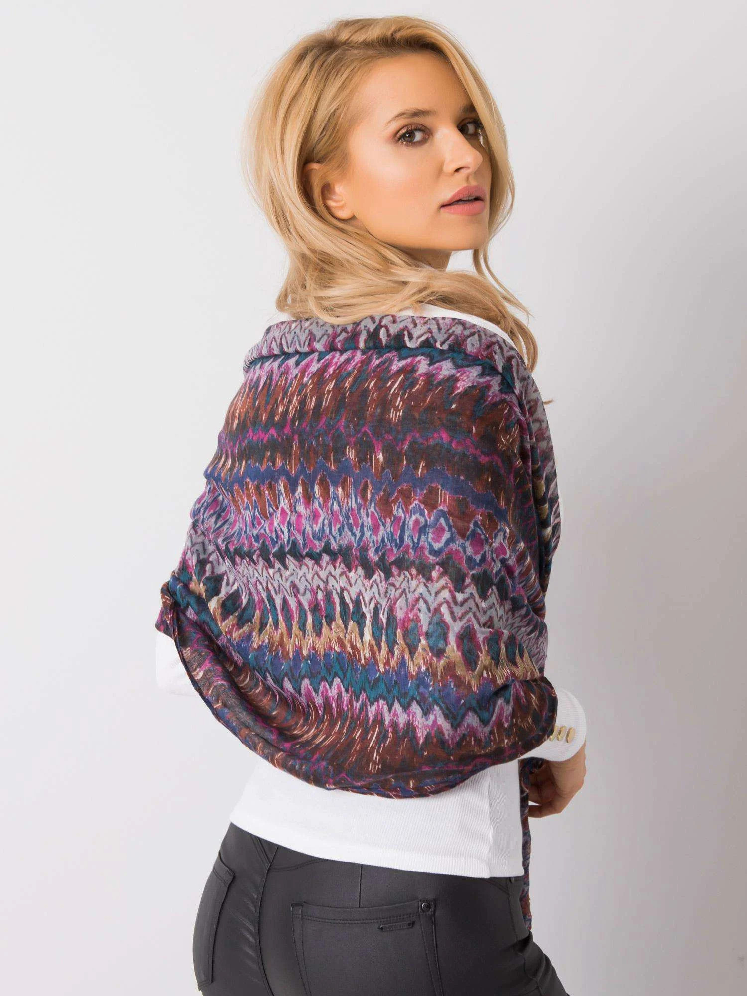 Vzorovaný fialový a hnědý šátek.