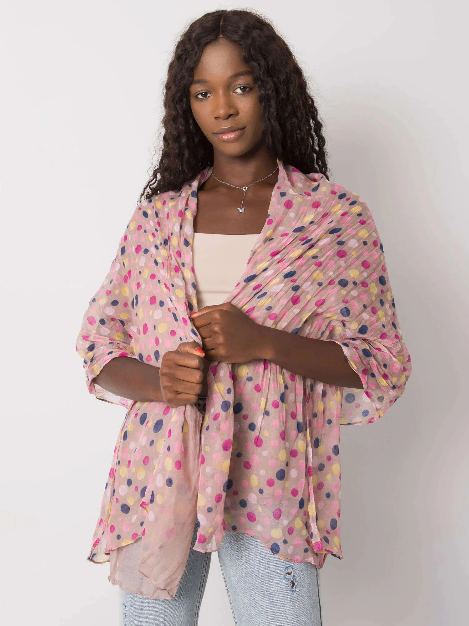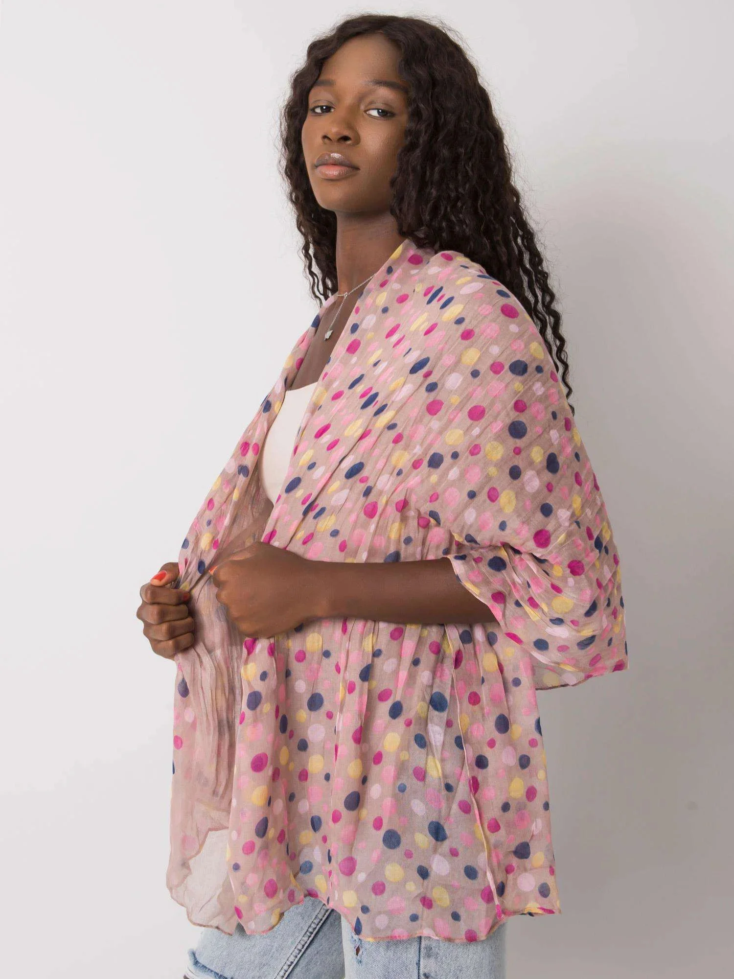 Béžový šátek s barevným hráškem.