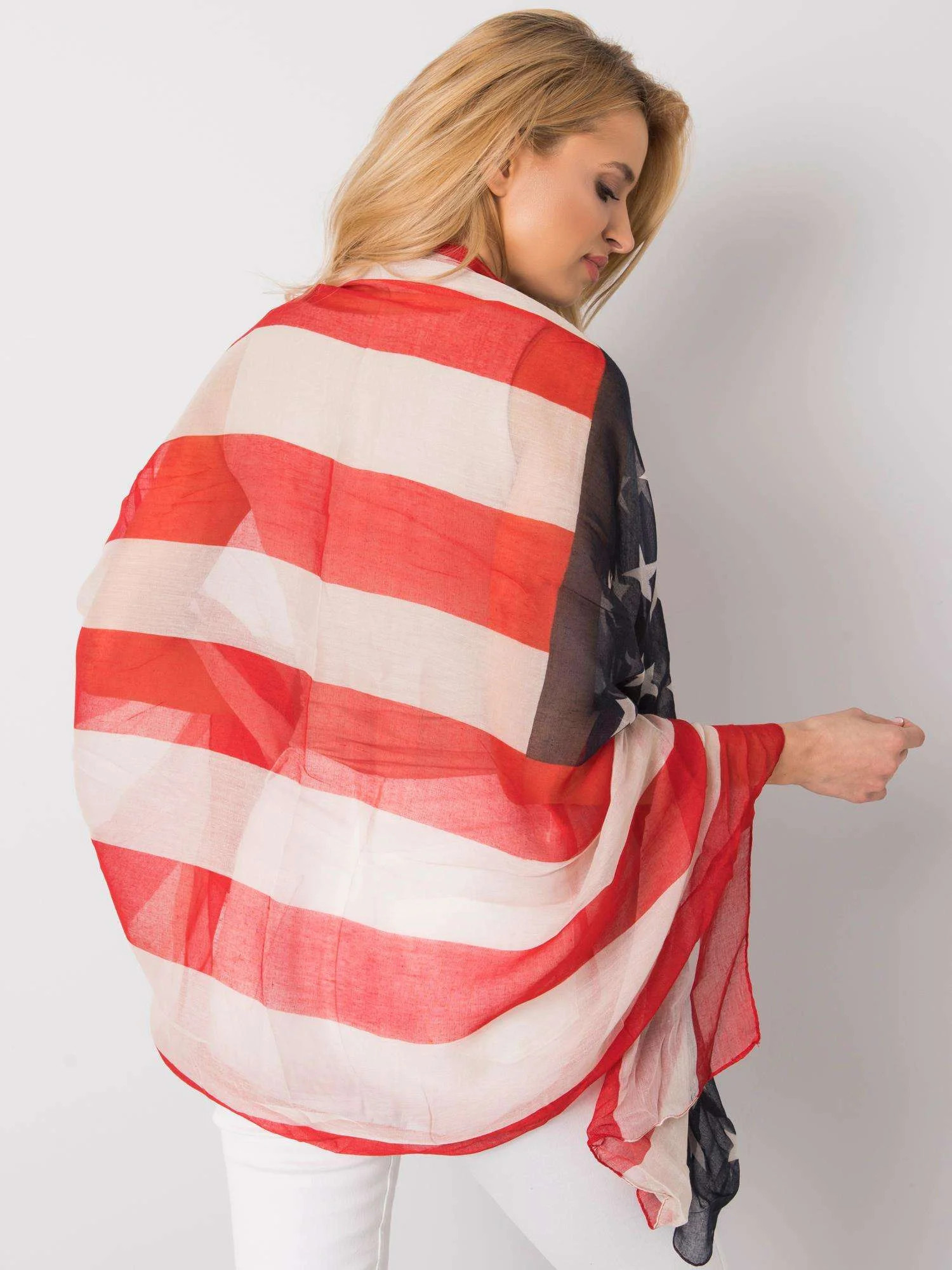Červenobéžová šála s potiskem.