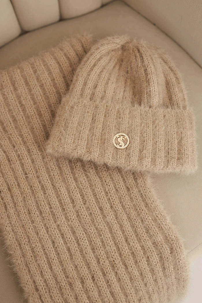 Ideální sada na zimní dny – jak na každodenní nošení, tak jako doplněk k elegantním stylizacím. Subtilní textura materiálu a ozdobná brož dodávají šarm a charakter.
