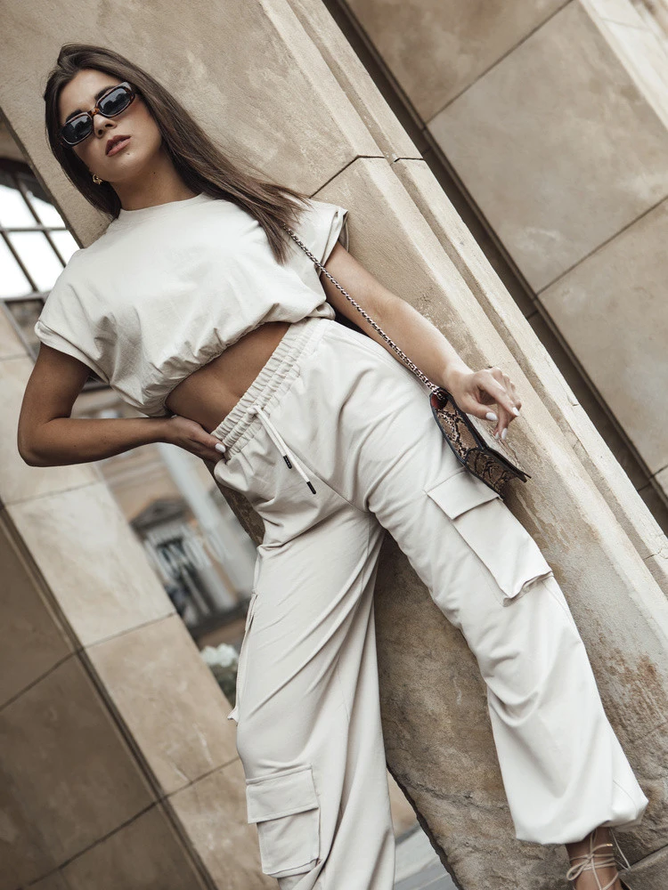 Souprava MALANS je typickým příkladem městské elegance pro každodenní nošení. Krátký top, který je mimořádně pohodlný na nošení, se dokonale kombinuje s volnými kalhotami s nastavitelnými šňůrkami a vytváří vzhled, který se jistě stane vaším novým oblíbeným. Kalhoty s cargo kapsami a ozdobnou nášivkou zdůrazní vaši individualitu a dodají vašemu každodennímu vzhledu nádech avantgardy.