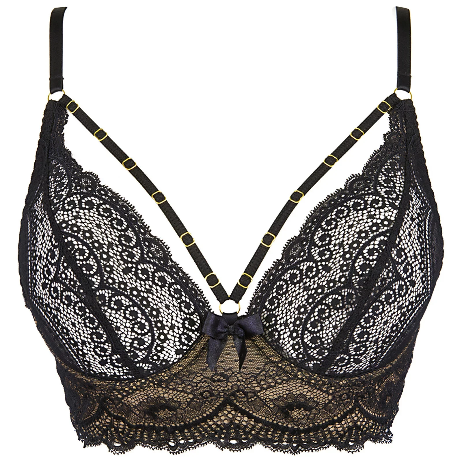 Tento extrémně stabilní a bohatě zdobený polokorzet si již našel cestu do srdcí zákazníků. Vyhrnutá část podprsenky pod prsy je podšitá tylem tělové barvy, přes který je výrazná černá krajka. Košíčky jsou také vyrobeny z jedné vrstvy krajky s bohatým vzorem, takže pohled pozorovatele se soustředí pouze na vás a vaše půvaby. Kromě toho jsou popruhy na hrudi a zádech zdobeny prvky ve zlaté barvě, aby v nočním světle výrazněji zářily. Model se zapíná pomocí pětiřadového zapínání na háčky a očka s dvoustupňovým nastavením obvodu. Popruhy u tohoto modelu nejsou odepsané.