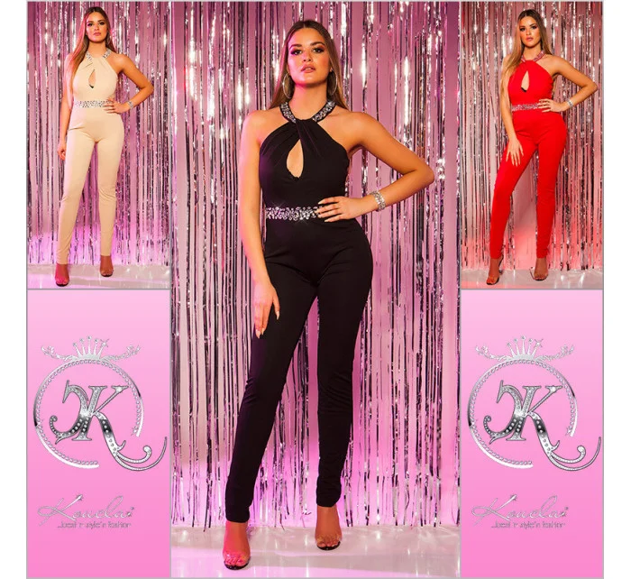 Dámský sexy overal s rafinovaným výstřihem OV18844 Béžová s kamínky - Koucla