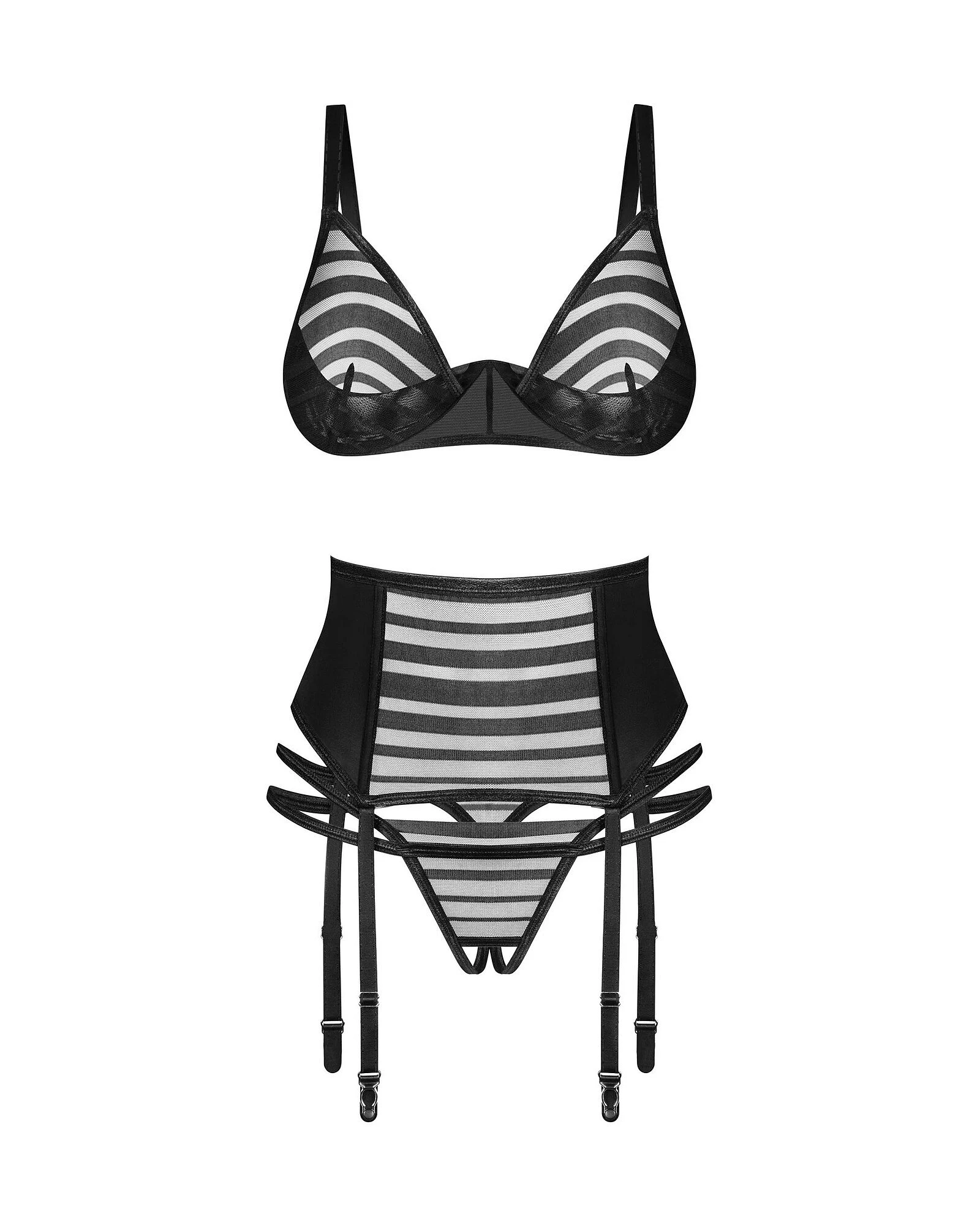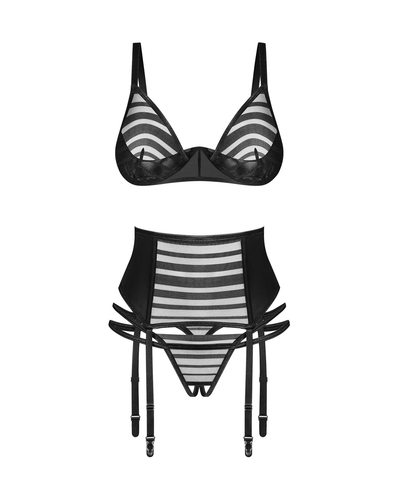 Tato prémiová sada se vyznačuje černými pruhy a je vyrobena z nejjemnějších materiálů nejvyšší kvality. Podprsenka má košíčky s kosticemi, zatímco podvazkový pás je vybaven nastavitelnými ramínky a svislými kosticemi pro dokonalé padnutí. Tanga s otevřeným střihem jsou zdobena dvojitou lemovkou, která jim dodává nádech sofistikovanosti.