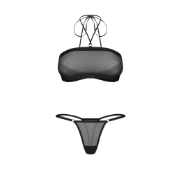 Top a tanga z průhledné síťoviny v moderním minimalistickém stylu. Elastický materiál se jemně přizpůsobí tělu, zatímco široký podprsní pás stabilizuje střih a zdůrazňuje siluetu. Jemné kovové detaily na přední straně dodávají designu lehce provokativní charakter. Perfektní set pro ženy, které rády zdůrazňují svůj individuální styl.