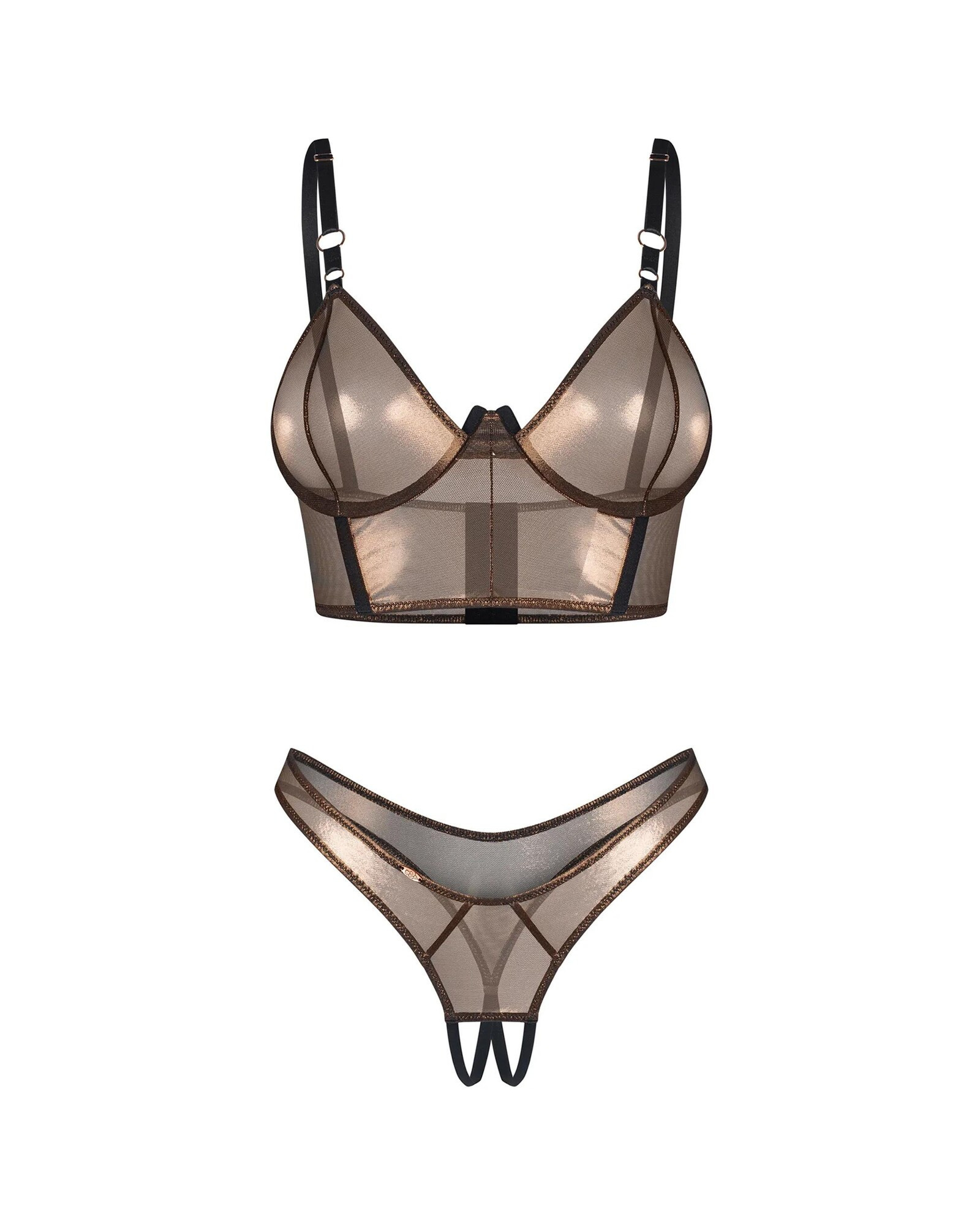 Smyslná kombinace lehkosti a odvážnosti. Tato souprava kombinuje průsvitnou síťovinu se zlatým leskem a přiléhavý střih, který zdůrazňuje ženskou siluetu. Podprsenka s kosticemi zvedá a zvýrazňuje poprsí, zatímco vertikální kostice jemně tvarují kontury těla. Tanga s otevřeným rozkrokem dodávají odvážný nádech a vybízejí k vášnivým hrátkám. Tato souprava spodního prádla byla vytvořena pro ženy, které rády září a svádějí.