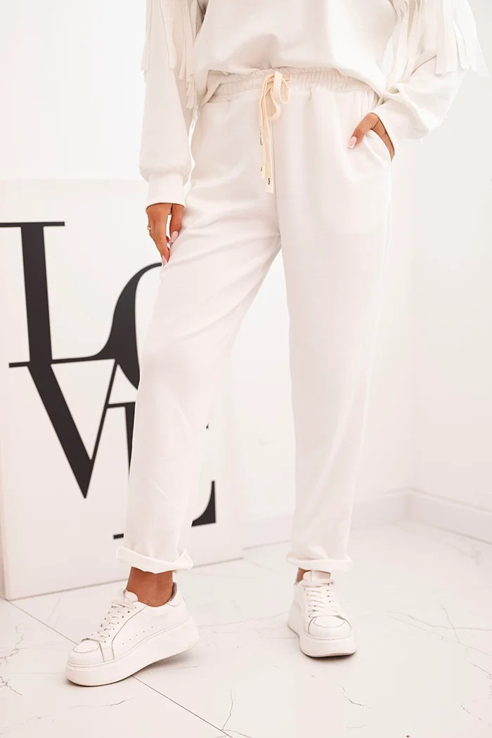 Elegantní dámský komplet v máslové barvě je kombinací pohodlí a módního designu. Mikina volného střihu je ozdobena efektními třásněmi na rukávech, které jí dodávají výjimečný charakter. Vyrobena z příjemného na dotek, elastického úpletu, zajišťuje volnost pohybu a komfort nošení. Kalhoty s elastickým pasem a regulací na šňůrku zaručují dokonalé přizpůsobení, a jejich jednoduchý střih skvěle ladí s mikinou. Tento komplet se hodí jak do každodenních stylizací, tak při setkání s přáteli.