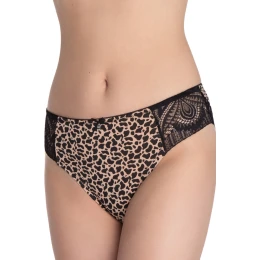 Figi LAMA w efektowny wzór panterki to propozycja dla kobiet, które cenią sobie połączenie modnego designu i komfortu noszenia. Model wykonano z miękkiej, przyjemnej w dotyku tkaniny, która idealnie dopasowuje się do sylwetki. Po bokach znajdują się wstawki z misternie zdobionej koronki, które nadają bieliźnie elegancji i delikatności. Figi świetnie sprawdzą się zarówno na co dzień, jak i jako element stylowego kompletu z dopasowanym biustonoszem. To idealny wybór dla kobiet lubiących podkreślać swój charakter poprzez detal.