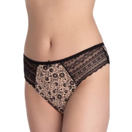 Figi LAMA w beżowym kolorze z czarnym, bogato zdobionym kwiatowym wzorem to propozycja dla kobiet, które cenią bieliznę łączącą komfort i efektowny styl. Przód fig przyciąga uwagę misternym, dekoracyjnym printem, nadając całości eleganckiego charakteru. Po bokach zastosowano szerokie koronkowe panele, które pięknie podkreślają linię bioder i dodają modelowi lekkości oraz zmysłowości.