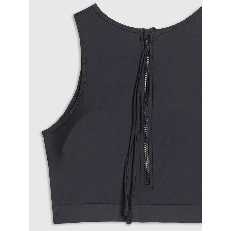 Sportowy krój typu bokserka z zabudowanym dekoltem oraz zamkiem z tyłu ułatwia zakładanie i zapewnia stabilność. Szeroka taśma pod biustem gwarantuje wsparcie, a miseczki z wyjmowanymi wkładkami pozwalają dostosować stopień podtrzymania i kształt do własnych preferencji.