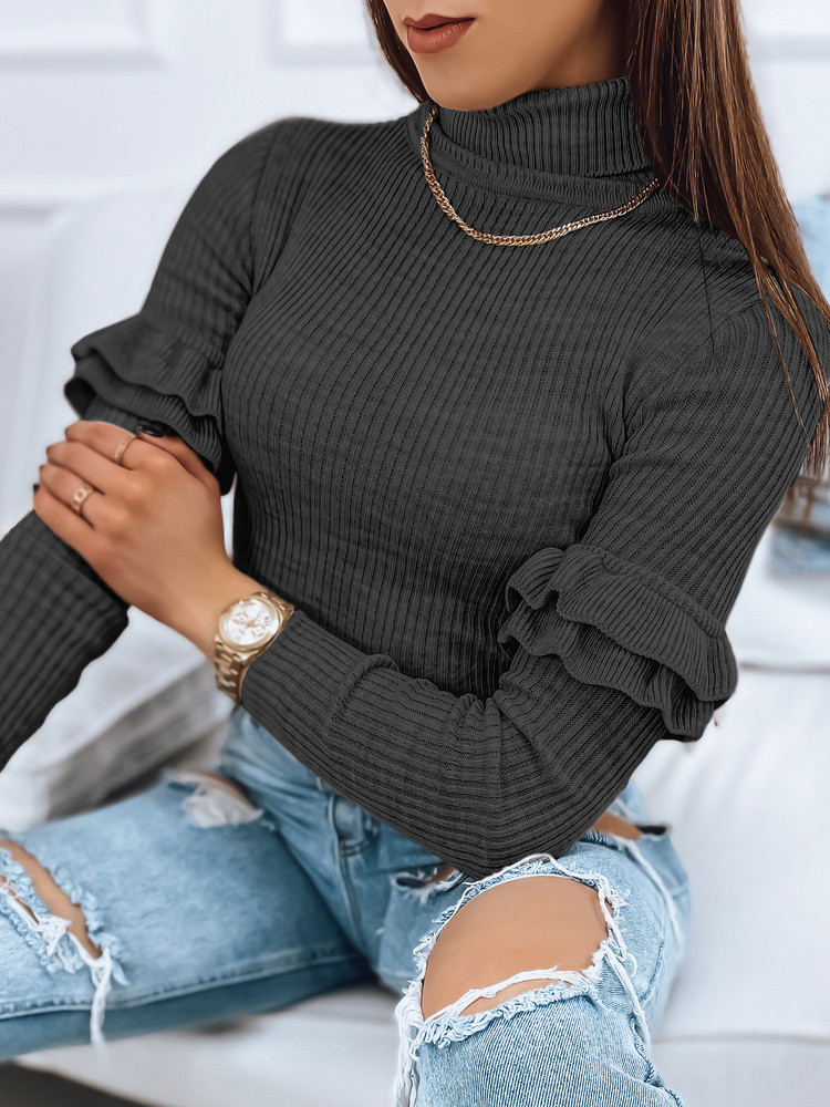 Dámský svetr BUFALO z jemného úpletu, žebrovaného a na dotek příjemného materiálu a minimalistického designu, s ozdobnými volánky na rukávech pro ležérní i společenský vzhled, k dostání v řadě barev.