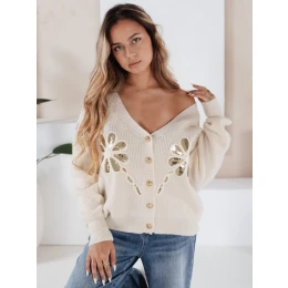 Sweter zapinany na guziki, ozdobiony aplikacjami w formie cekinowych kwiatów. Miękki materiał i luźniejszy krój zapewniają komfort, a dekoracyjne detale przyciągają uwagę. Idealny na sezon przejściowy, świetnie pasuje do jeansów i spódnic.