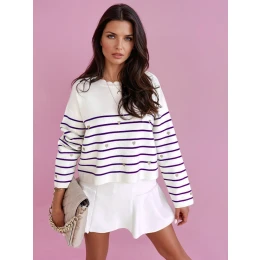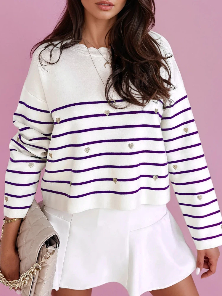 Kombinace elegance a pohodlí. Je vyroben z látky příjemné na dotek, potěší vás pohodlím při nošení a jedinečným stylem. Dlouhý rukáv vás zahřeje a ozdobný výstřih mu dodává jedinečný šarm. Tento model zdobí jemné nadčasové proužky a ozdobná srdíčka pro jedinečný styl. Bude dokonalým doplňkem vaší podzimní stylizace!