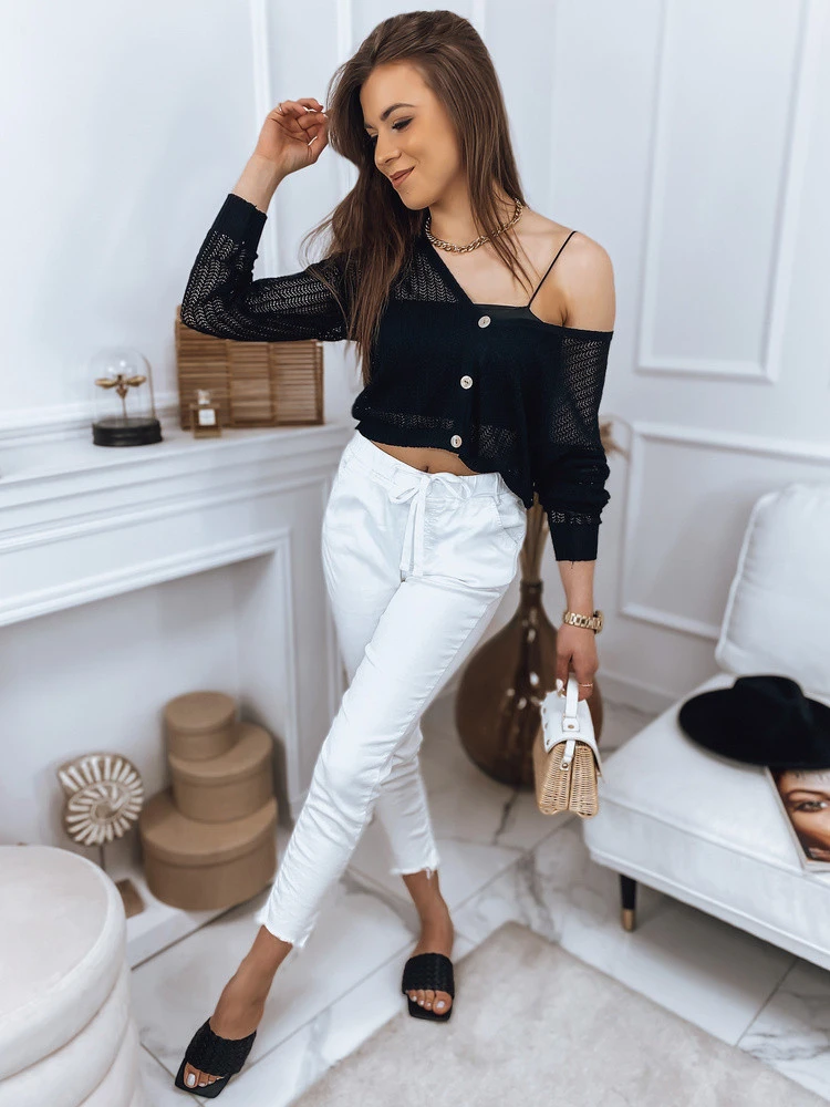 Tento ažurový svetr s ozdobnými knoflíky a volným střihem lze nosit různými způsoby, např. na jedno rameno, na břiše nebo rovně. Je ideálním doplňkem letního vzhledu a je k dispozici v několika barevných provedeních.