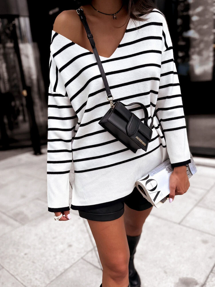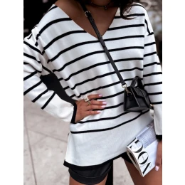Svetr HECATE je ideální pro podzim! Díky dlouhým rukávům a delšímu střihu poskytuje tento svetr nejen jedinečný styl, ale také naprosté pohodlí. Nadčasové pruhy jsou ideální pro podzimní stylizaci, zatímco výstřih do V dodává charakter. Nezbytný doplněk vašeho šatníku!