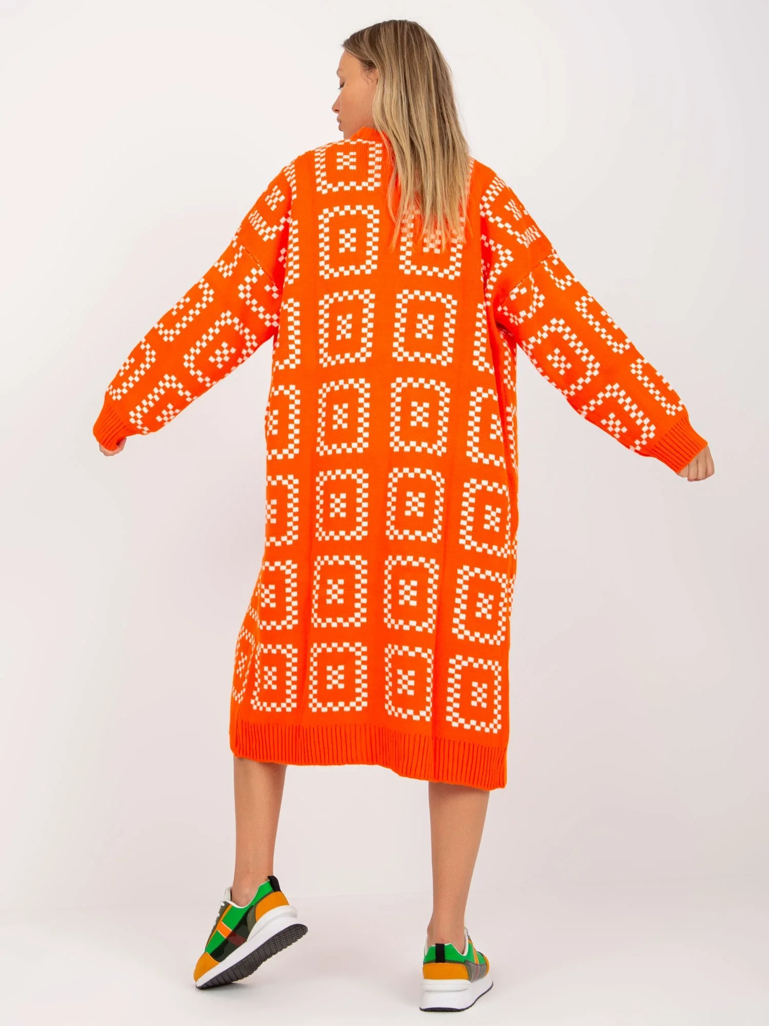 Rozměry svetru v jedné velikosti měřené na plocho: šířka v podpaží - 67 cm, celková délka - 108 cm, délka rukávu - 58 cm.