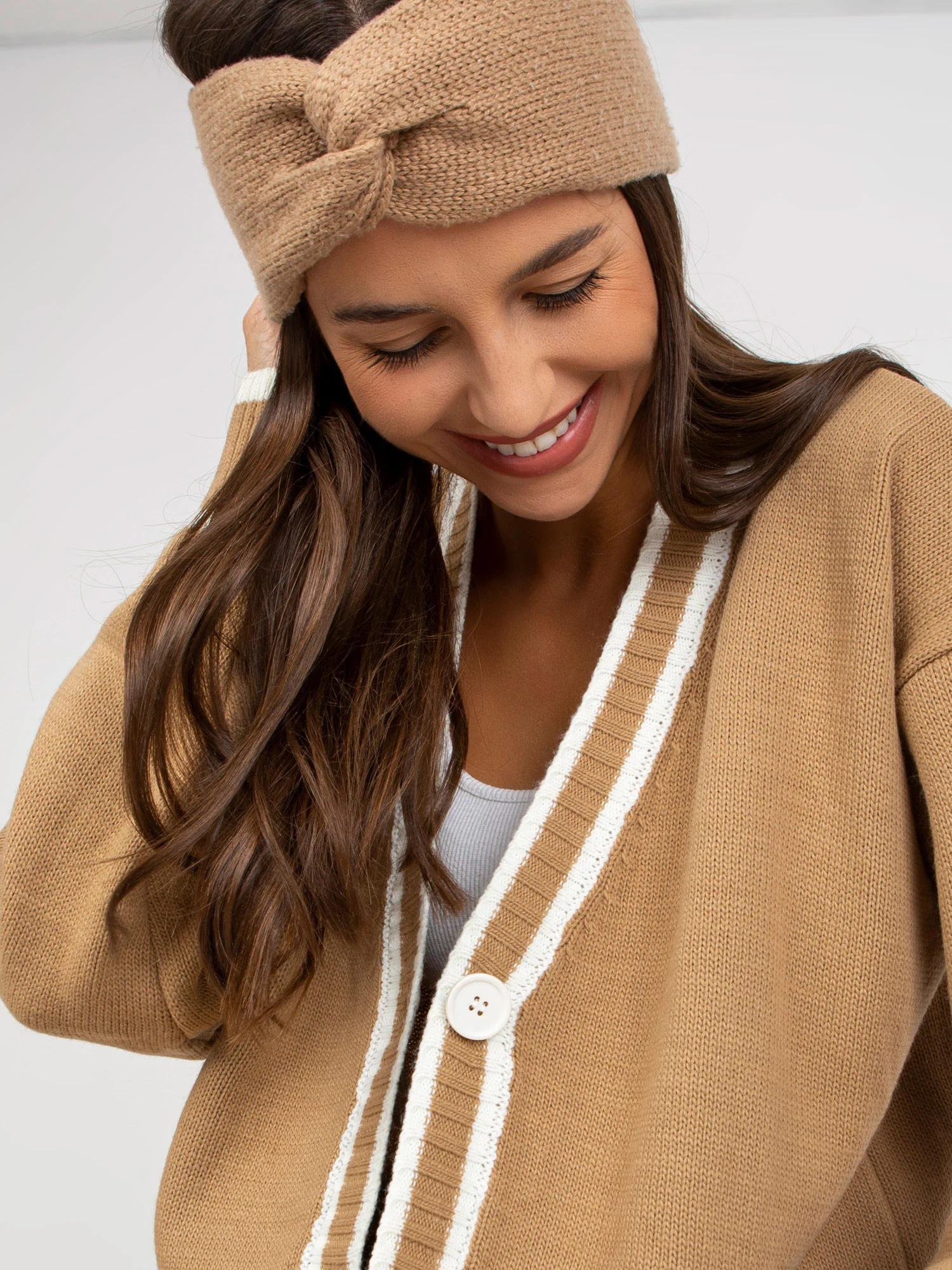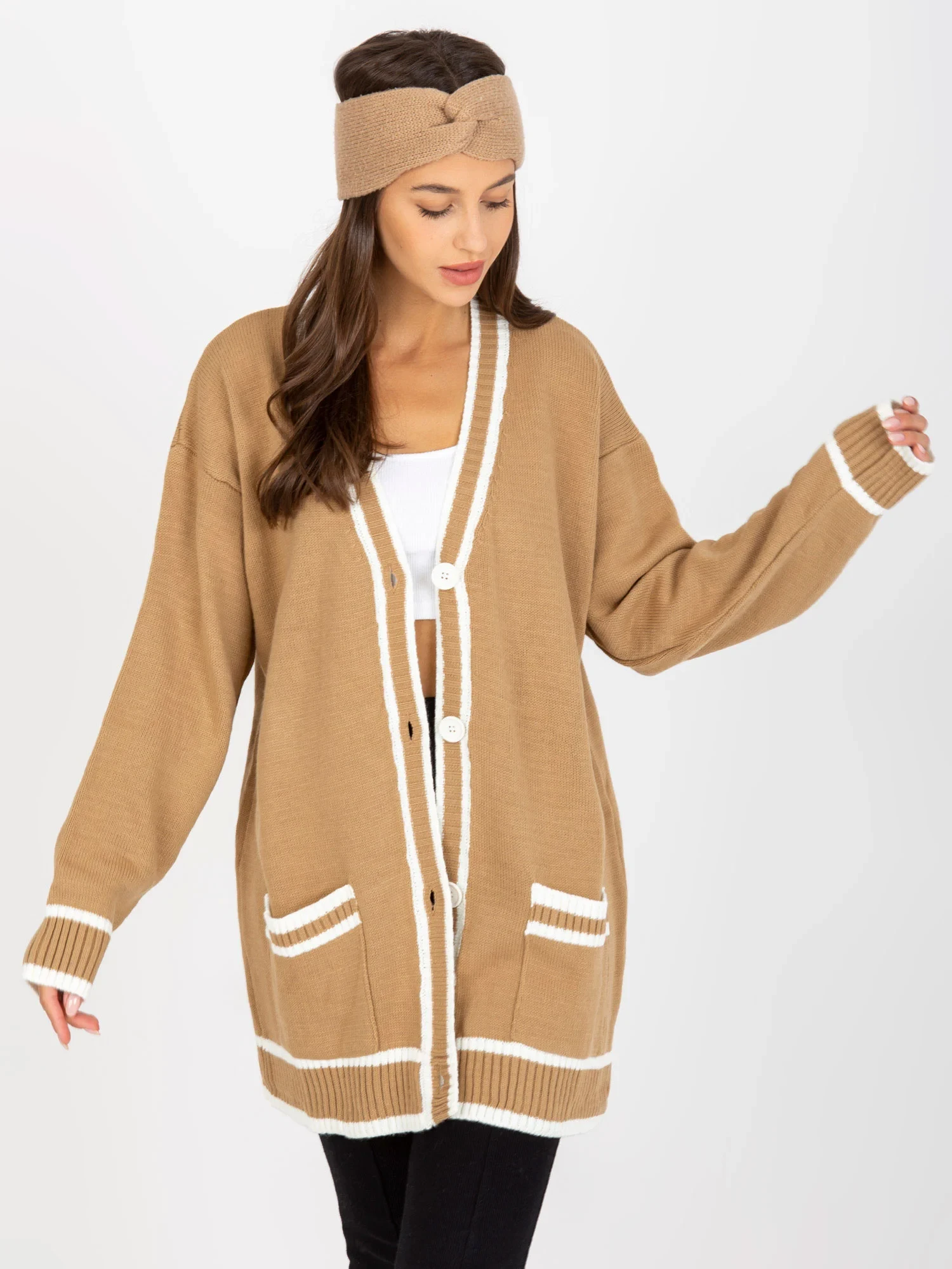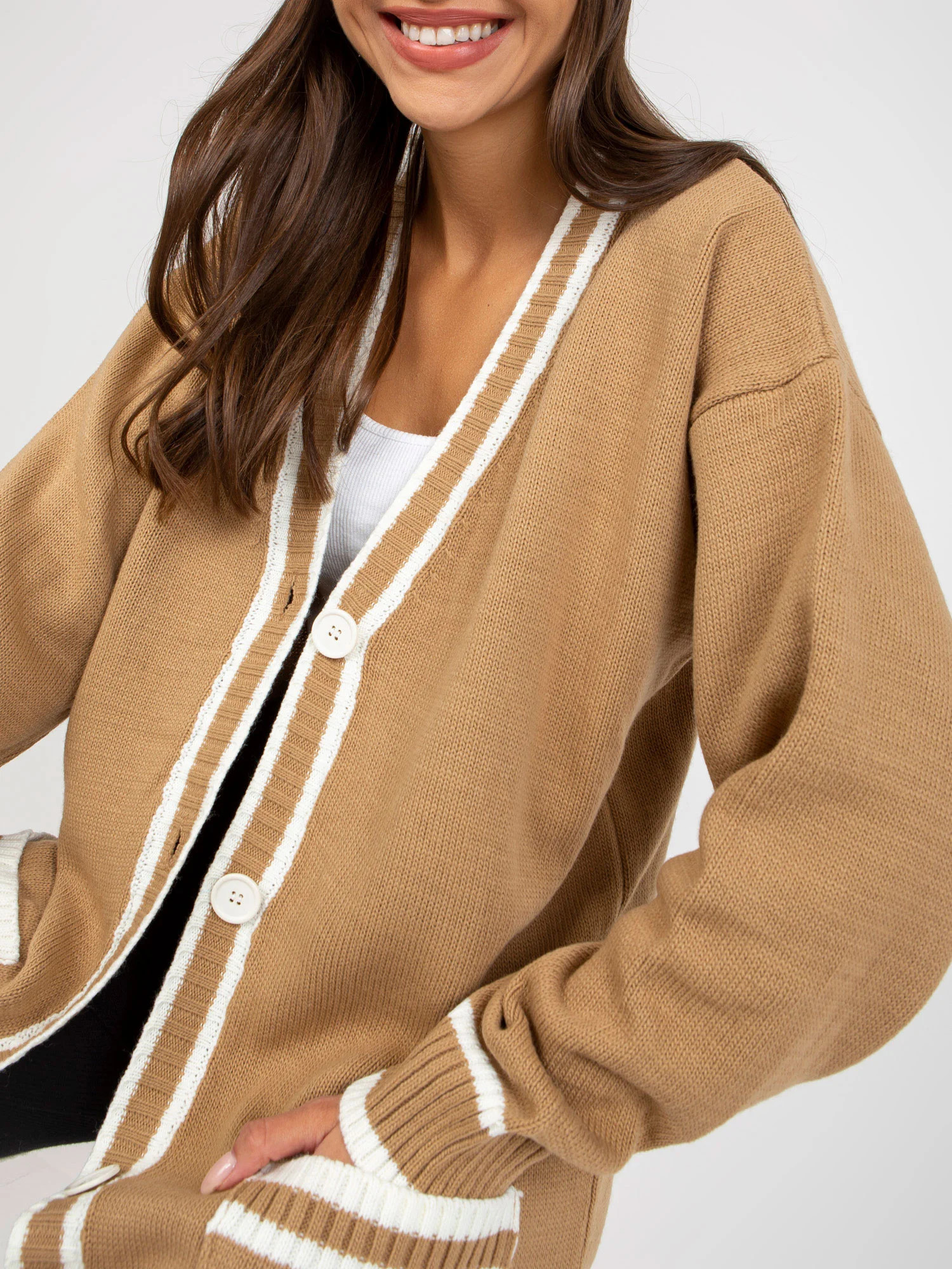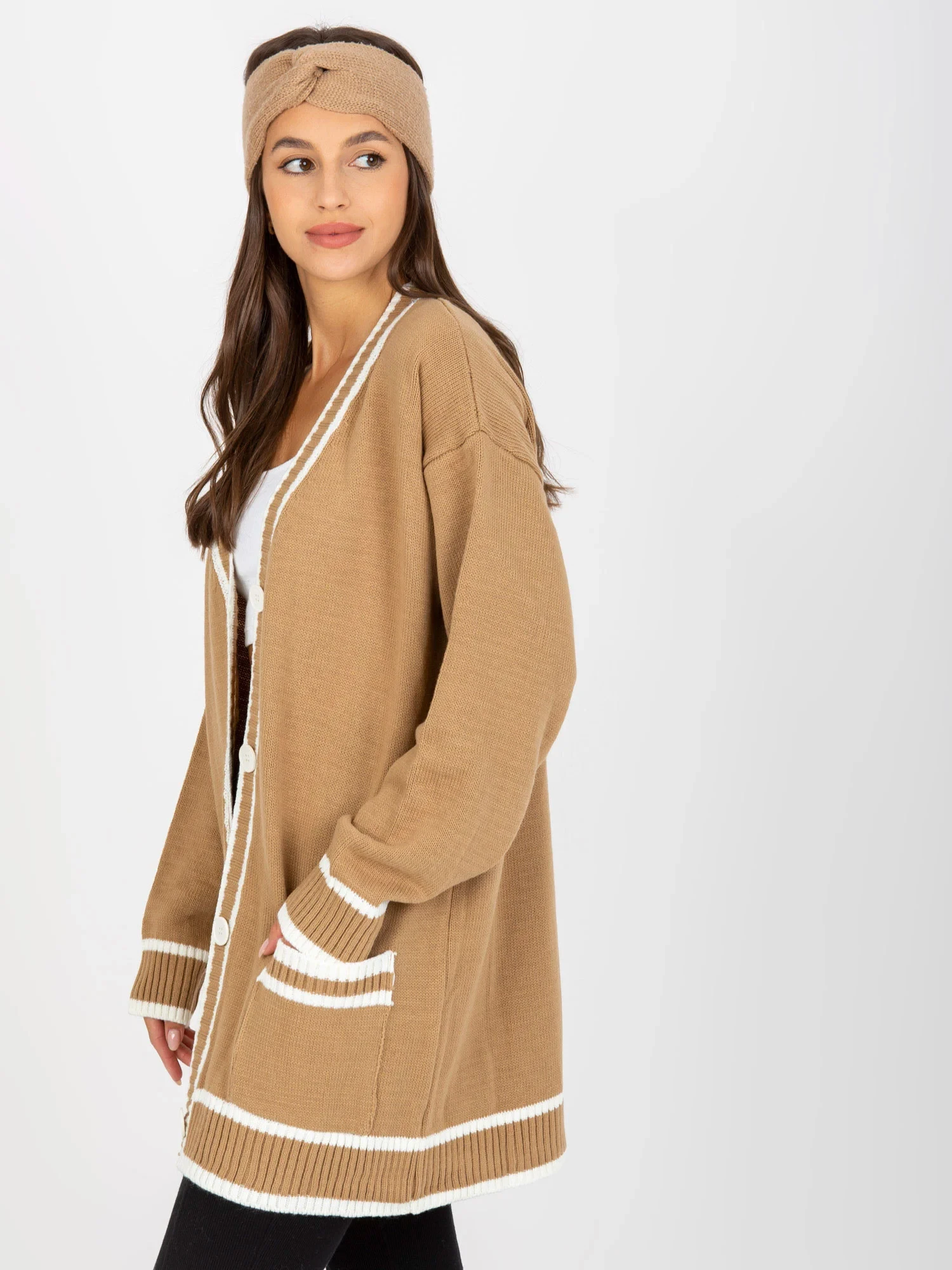 Tmavě béžový elastický svetr s kapsami od RUE PARIS .