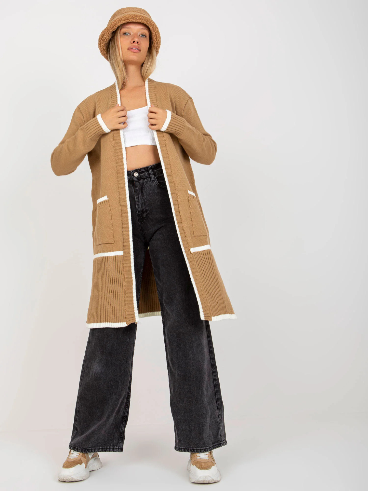Rozměry svetru v jedné velikosti měřené na plocho: šířka v podpaží - 60 cm, celková délka - 99 cm, délka rukávu - 63 cm.EAN čárové kódy zboží jsou: