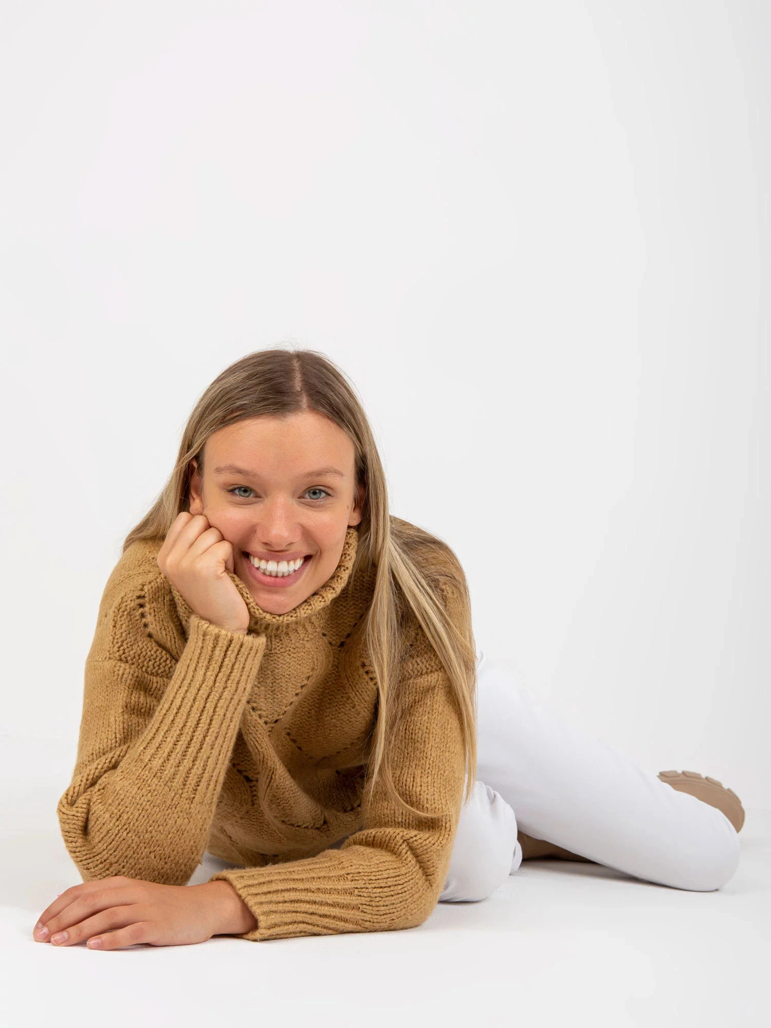 Velbloudí ažurový svetr s rolákem ovrsize střihu od RUE PARIS .