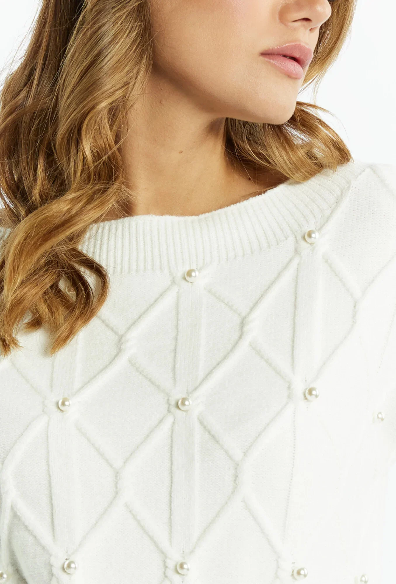 Dámský svetr s úpletem. Svetr s dlouhými rukávy a půlkruhovým výstřihem. Kromě toho je svetr zdoben malými korálky. Tento model bude jistě dobře fungovat v chladných dnech. Modelka na fotografii měří 177 cm a nosí velikost S.