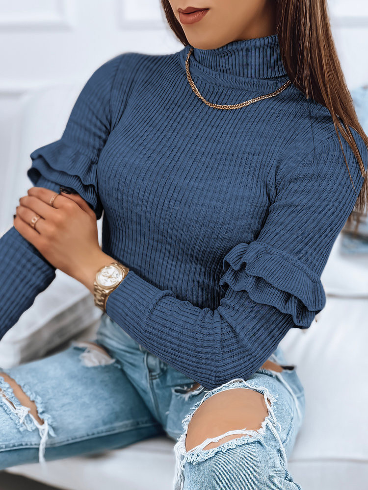 Dámský svetr BUFALO z jemného úpletu, žebrovaného a na dotek příjemného materiálu a minimalistického designu, s ozdobnými volánky na rukávech pro ležérní i společenský vzhled. K dostání v řadě barev.