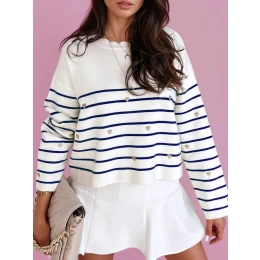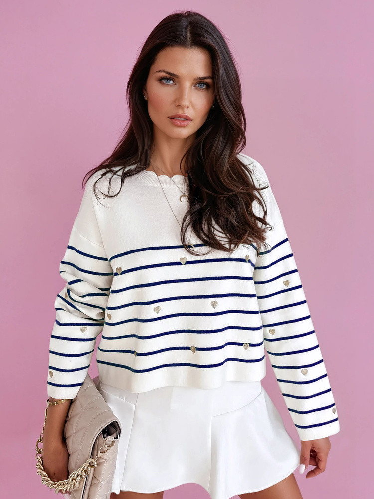 Kombinace elegance a pohodlí. Je vyroben z látky příjemné na dotek, potěší vás pohodlím při nošení a jedinečným stylem. Dlouhý rukáv vás zahřeje a ozdobný výstřih mu dodává jedinečný šarm. Tento model zdobí jemné nadčasové proužky a ozdobná srdíčka pro jedinečný styl. Bude dokonalým doplňkem vaší podzimní stylizace!