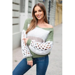 Dámský svetr pruhovaný s copánky na rukávech z vlny khaki + šedý