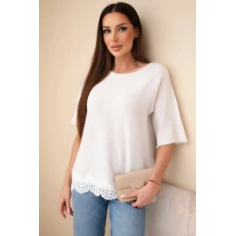 Tento dámský svetr s krátkým rukávem a jemným krajkovým zakončením je ideální volbou pro ženy, které si cení eleganci a pohodlí na každý den. Delikátní krajka na spodním okraji dodává blůzce půvab a ženský charakter, což ji činí skvělou nabídkou jak do práce, tak na setkání s přáteli.