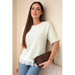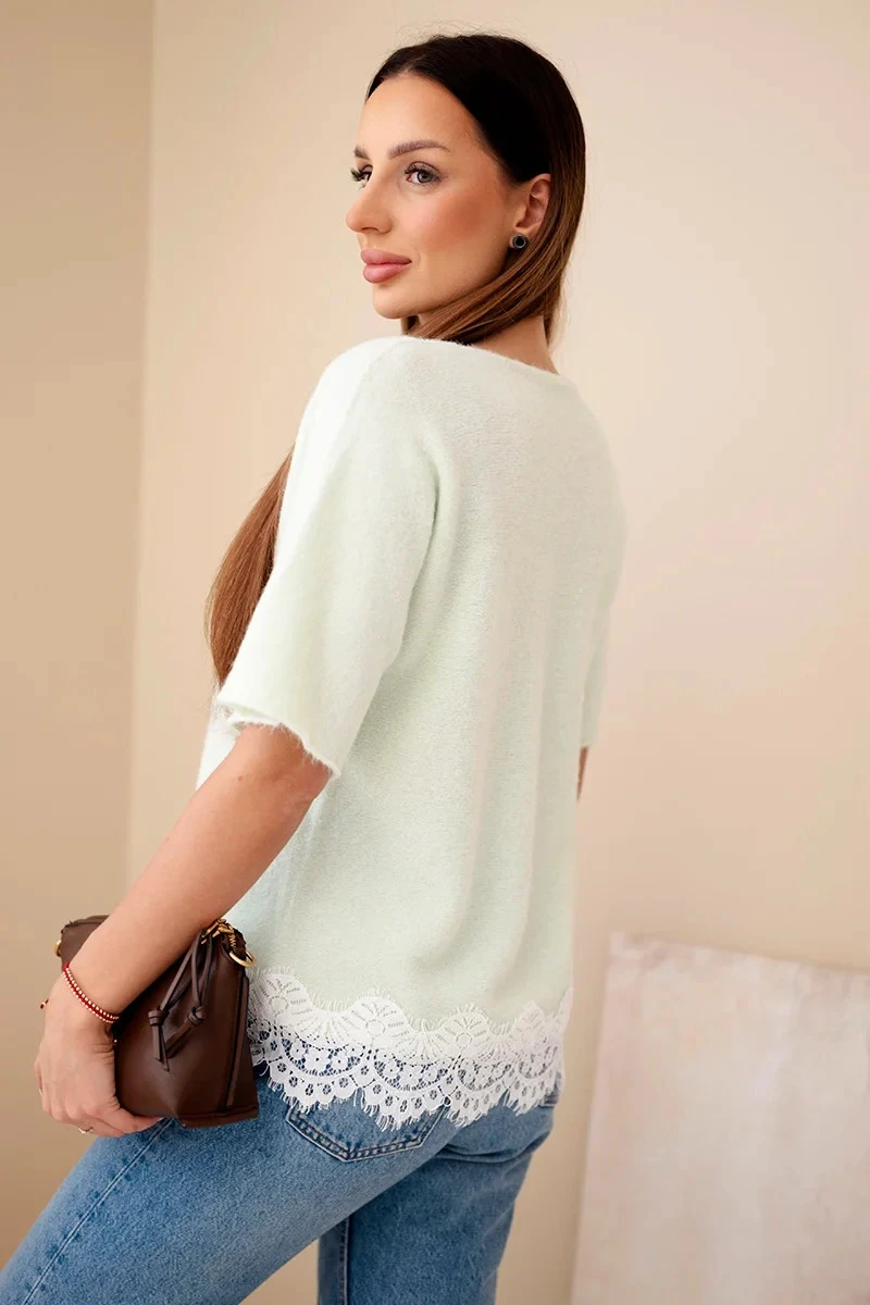 Dámský svetr s krátkým rukávem a krajkou mátový