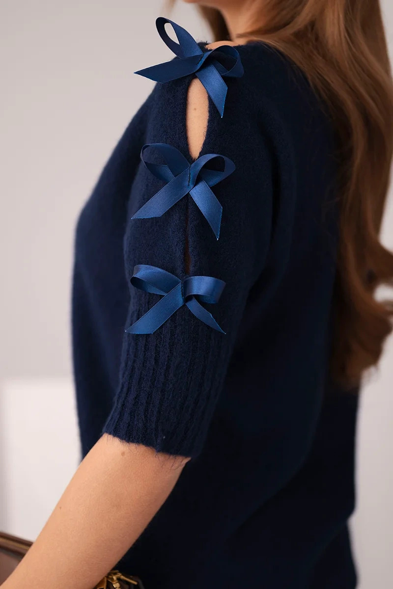Dámský svetr s krátkým rukávem a ozdobnými mašlemi granátový