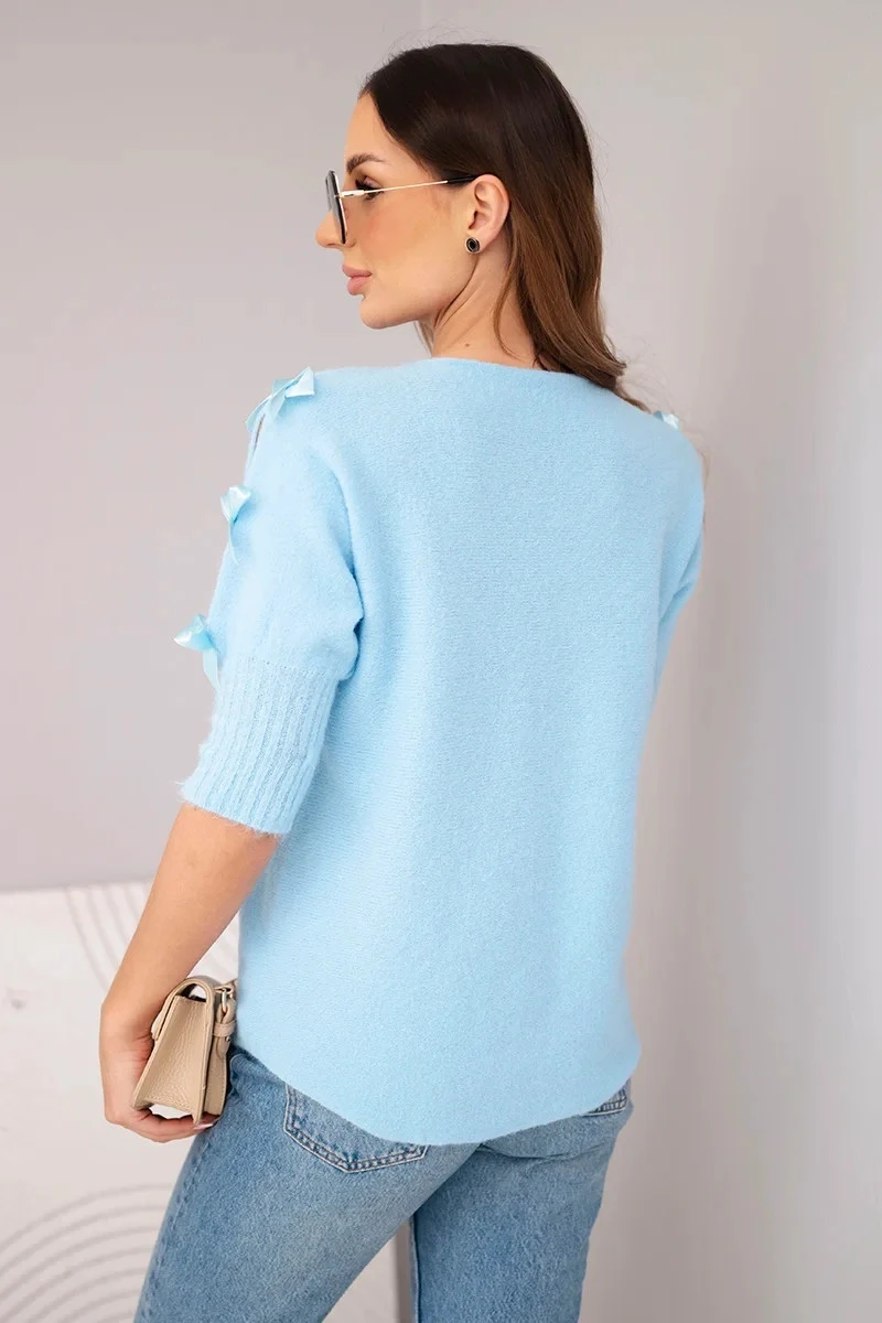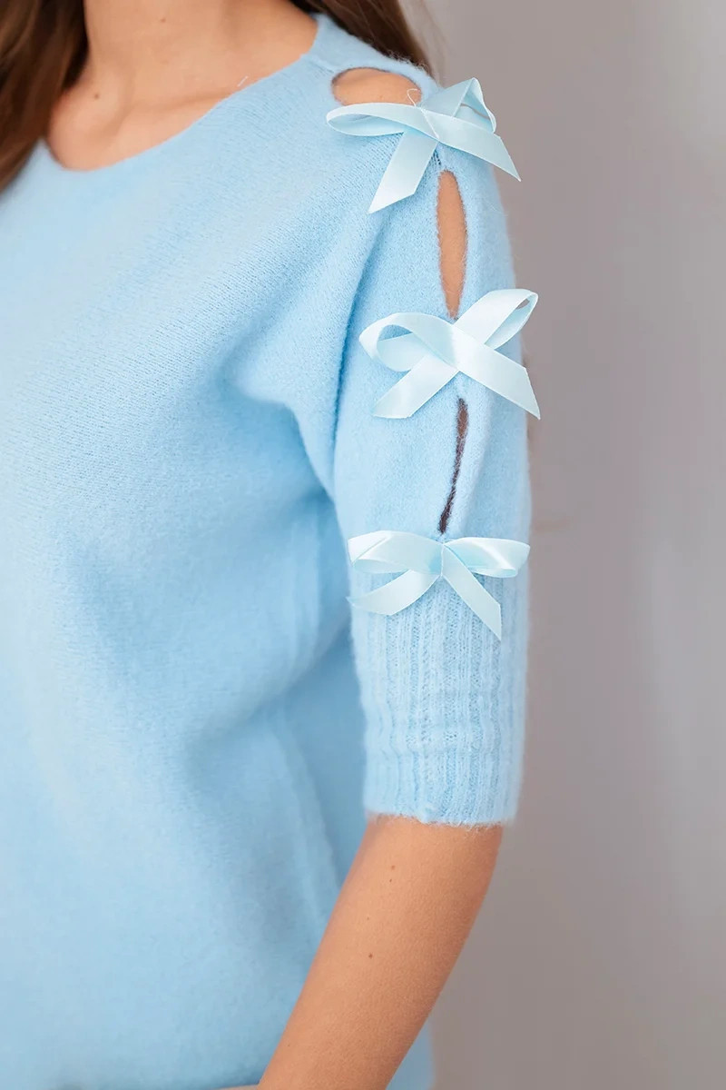 Dámský svetr s krátkým rukávem a ozdobnými mašličkami modrý