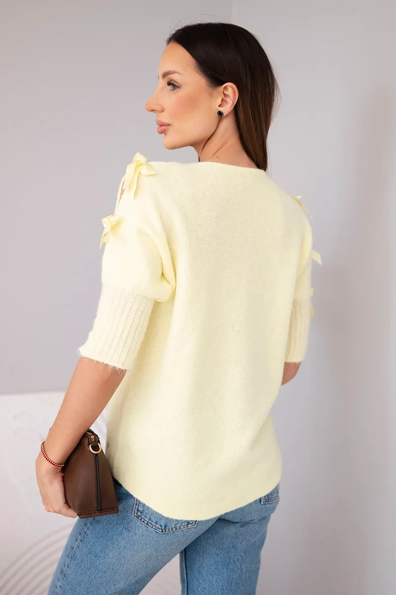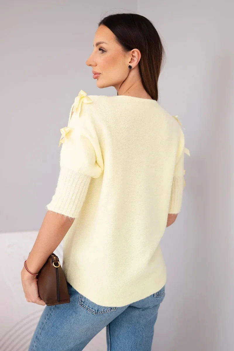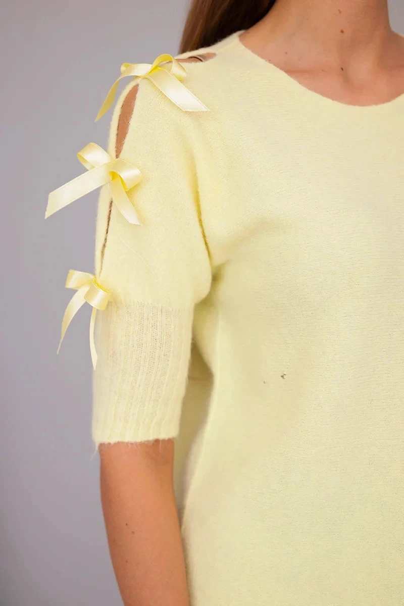 Dámský svetr s krátkým rukávem a ozdobnými mašličkami žlutý