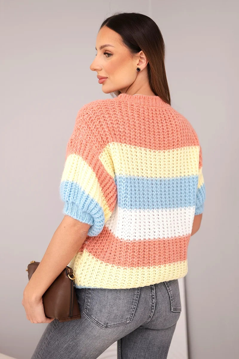Tento dámský svetr s otvoreným vzorem v barevných pruzích je skvělou volbou pro ženy, které oceňují pohodlí a styl v jednom. Vyznačuje se volným pletením a krátkými, širokými rukávy, díky čemuž je ideální na teplejší dny. Kombinace pastelových barev mu dodává dívčí kouzlo a lehkost, a měkká příze zajišťuje příjemné nošení. Je to skvělá volba na každodenní vycházky, procházky nebo kávu s přítelkyní – stačí ho spojit s džíny nebo sukní, abyste vytvořili stylový, casual outfit.
