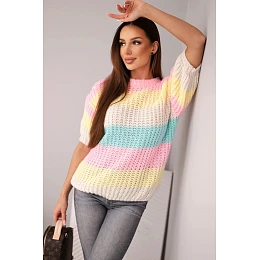 Dámský svetr s krátkým rukávem v barevných pruzích krajkový světle růžový