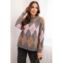 Dámský svetr s diamantovým vzorem a jemným průsvitem je ideální kombinací klasiky a moderního stylu. Vyznačuje se geometrickým vzorem v módních barvách a jemnými perforovanými detaily, které mu dodávají lehkost a ženský charakter. Klasický, jednoduchý střih s kulatým výstřihem činí svetr skvěle padnoucím na postavu a je vhodný pro mnoho stylizací – jak každodenních, tak elegantnějších. Měkký materiál s přídavkem vlny a viskózy zajišťuje pohodlí při nošení a ochranu před chladem. To je ideální volba na podzim a zimu!