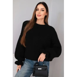 Dámský svetr s přídavkem mohairu s hrubým pletením a ozdobnými rukávy černý