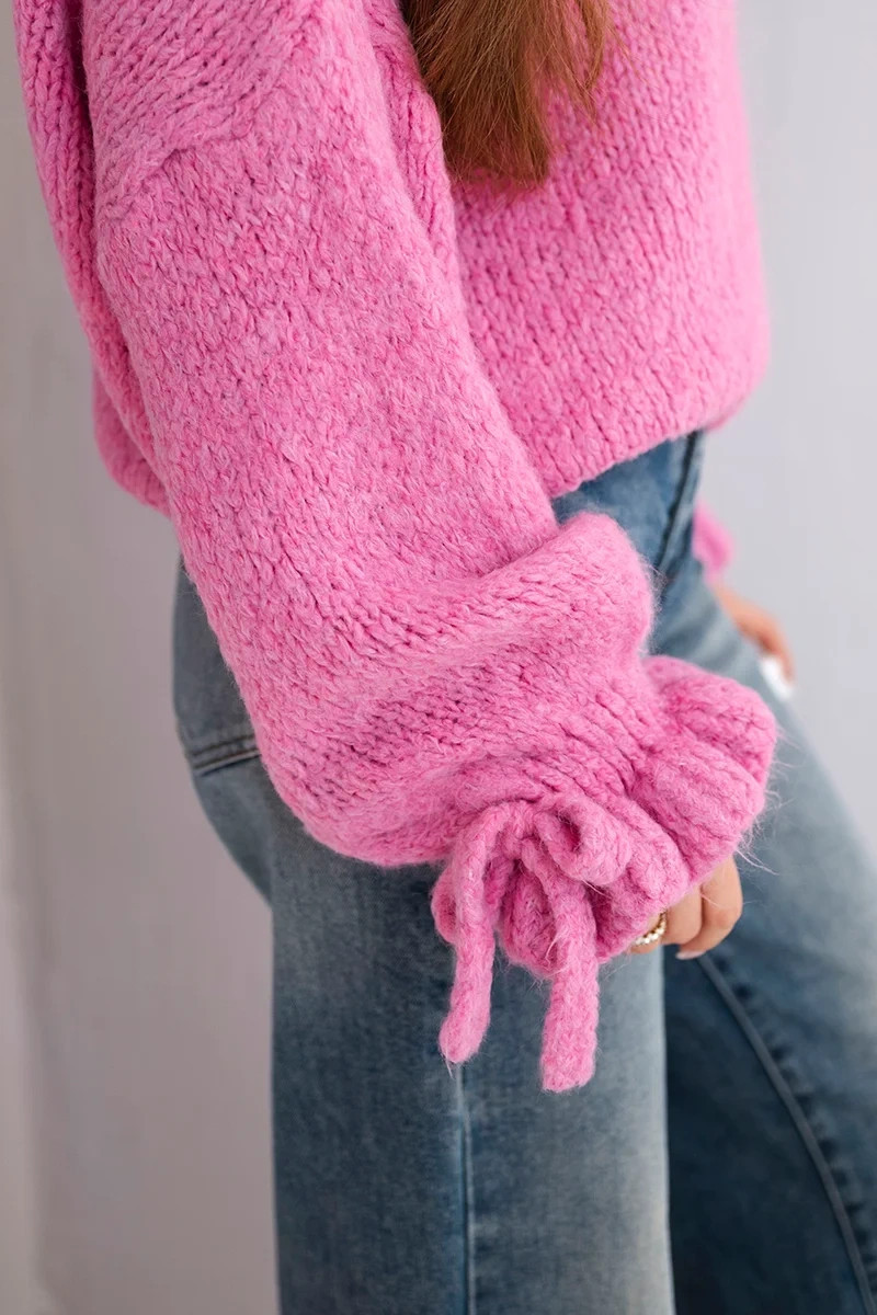Tento dámský svetr s hrubým pletením je ideální volbou na chladnější dny. Vyniká stylovým, oversize střihem a roztomilými detaily na rukávech ve formě uzlů, které mu dodávají charakter. Díky své měkké a nadýchané struktuře zajišťuje nejen módní vzhled, ale také komfort nošení každý den.
