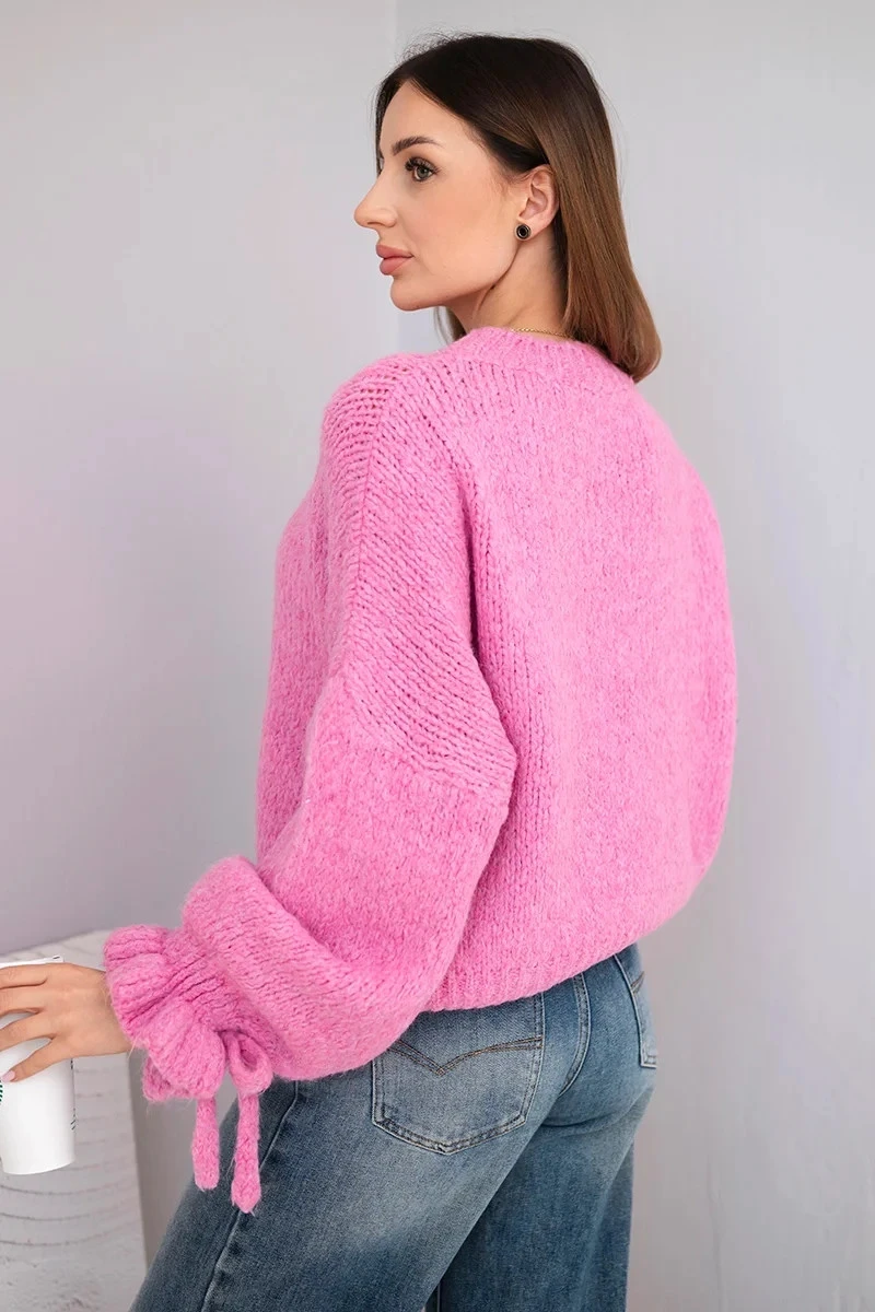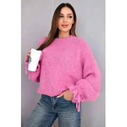 Dámský svetr s přídavkem mohéru s model 21857675 pletením a ozdobnými rukávy růžový - K-Fashion