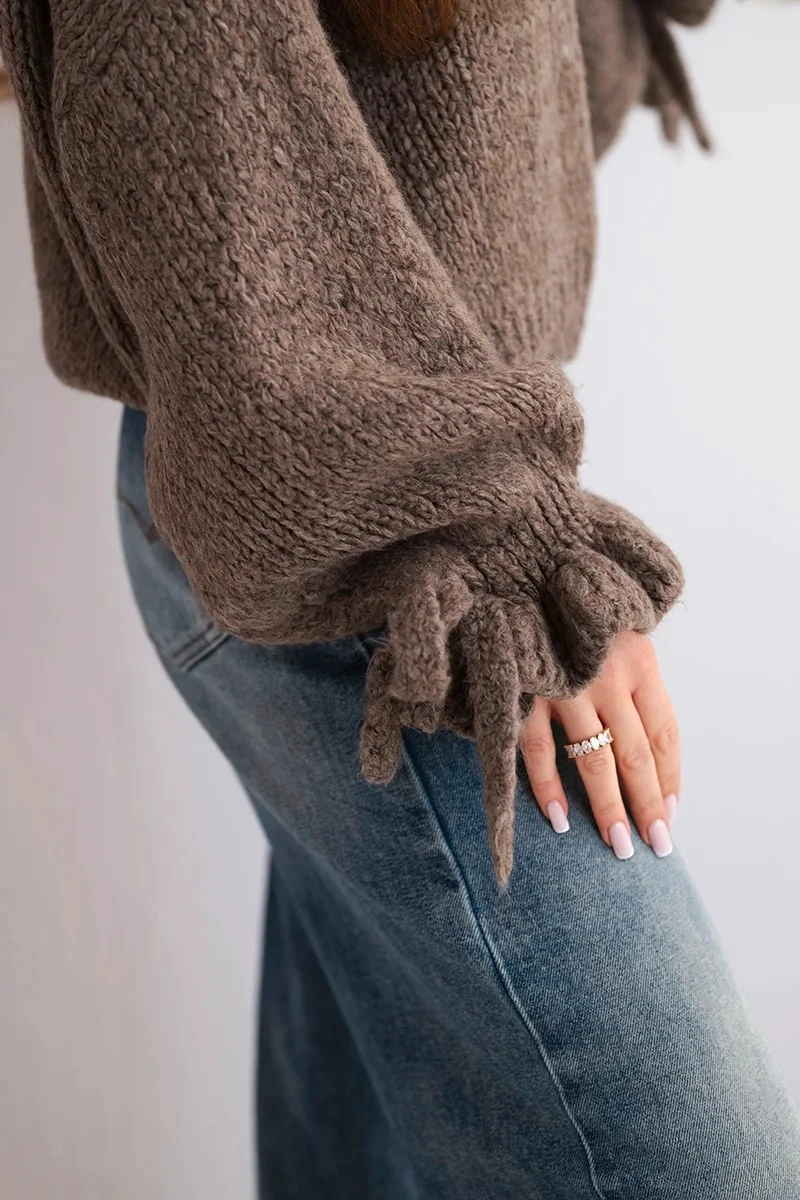 Tento dámský svetr s hrubým pletením je ideální volbou na chladnější dny. Vyniká stylovým, oversize střihem a roztomilými detaily na rukávech ve formě uzlů, které mu dodávají charakter. Díky své měkké a nadýchané struktuře zajišťuje nejen módní vzhled, ale také komfort nošení každý den.