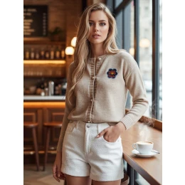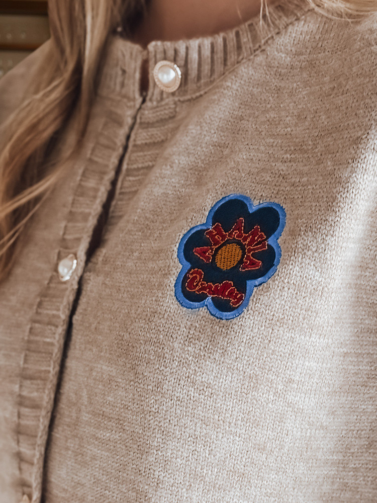 Sweter o kroju one size, zapinany na ozdobne guziki, z subtelnym haftem na piersi. Dzięki przyjemnemu w dotyku materiałowi gwarantuje komfort noszenia przez cały dzień. Uniwersalny rozmiar pasuje od XS do L. Ściągacze przy rękawach i na dole dodają mu kształtu i podkreślają jego casualowy charakter. Sprawdzi się zarówno w zestawach z jeansami, jak i spódnicą.