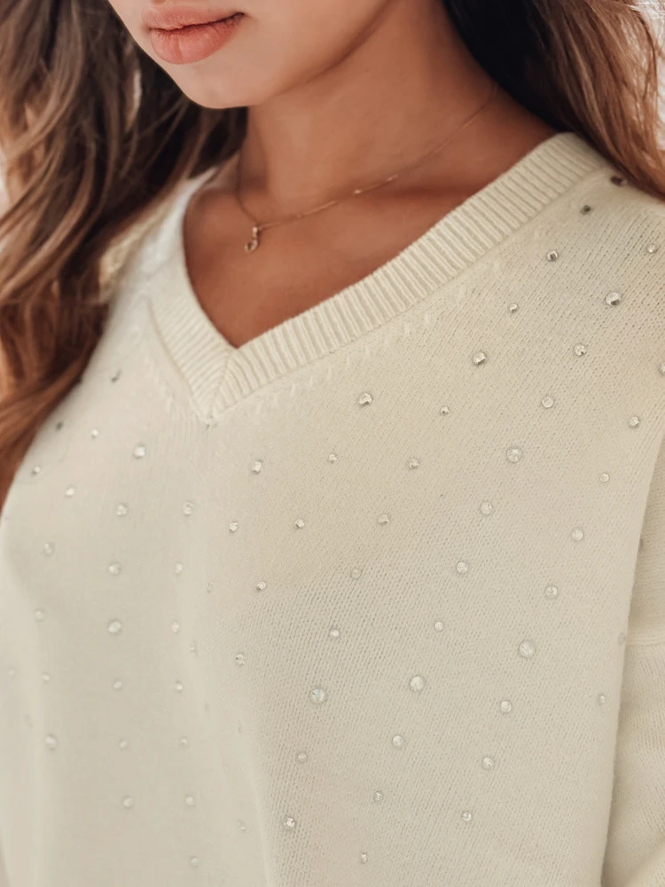 Tento elegantní svetr s jemným zdobením je ideální pro chladnější dny. Volnější střih zajišťuje pohodlí, zatímco výstřih do V krásně zvýrazňuje krk. Jemné třpytivé aplikace dodávají charakter a malá mašlička na lemu je módním detailem.