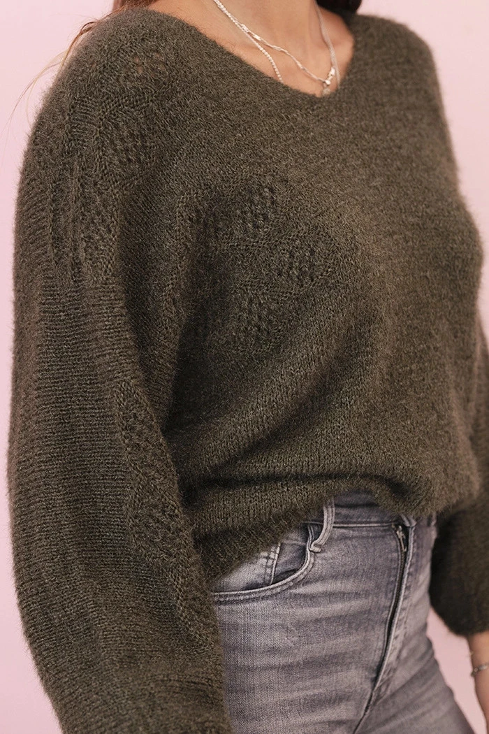 Dámský svetr z mohairu volného střihu s výstřihem do V khaki