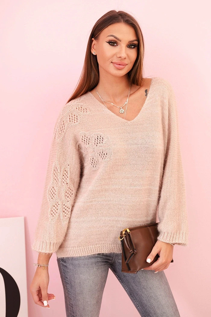 Dámský svetr z mohéru volného střihu s výstřihem do V béžový