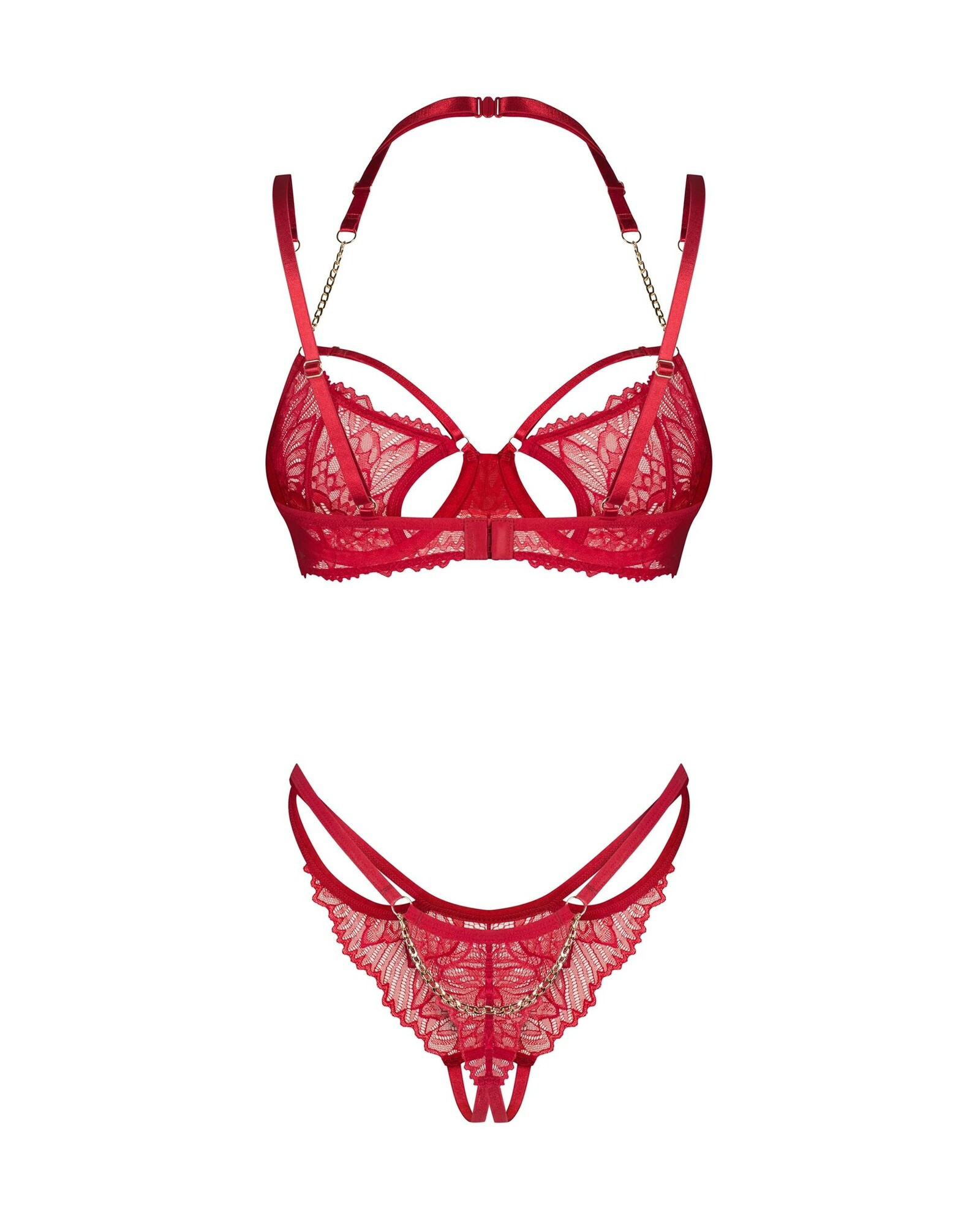 Sytě červená barva, elegantní krajka a detaily, které nikdo nepřehlédne. Podprsenka s kosticemi jemně zdůrazňuje poprsí, zatímco zlaté řetízky na ramínkách dodávají jedinečný nádech. Tanga s otevřeným rozkrokem, zdobená krajkou a třpytivým řetízkem přes zadní část, jsou čistou fantazií. Každý detail zde má svůj význam – dokonce i malý přívěsek vpředu, který koketně upoutá pozornost. Je to více než jen spodní prádlo. Je to příslib večera plného potěšení a vášně.