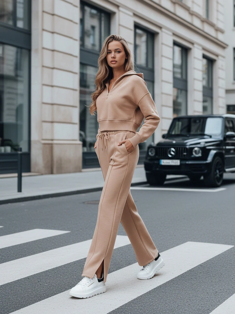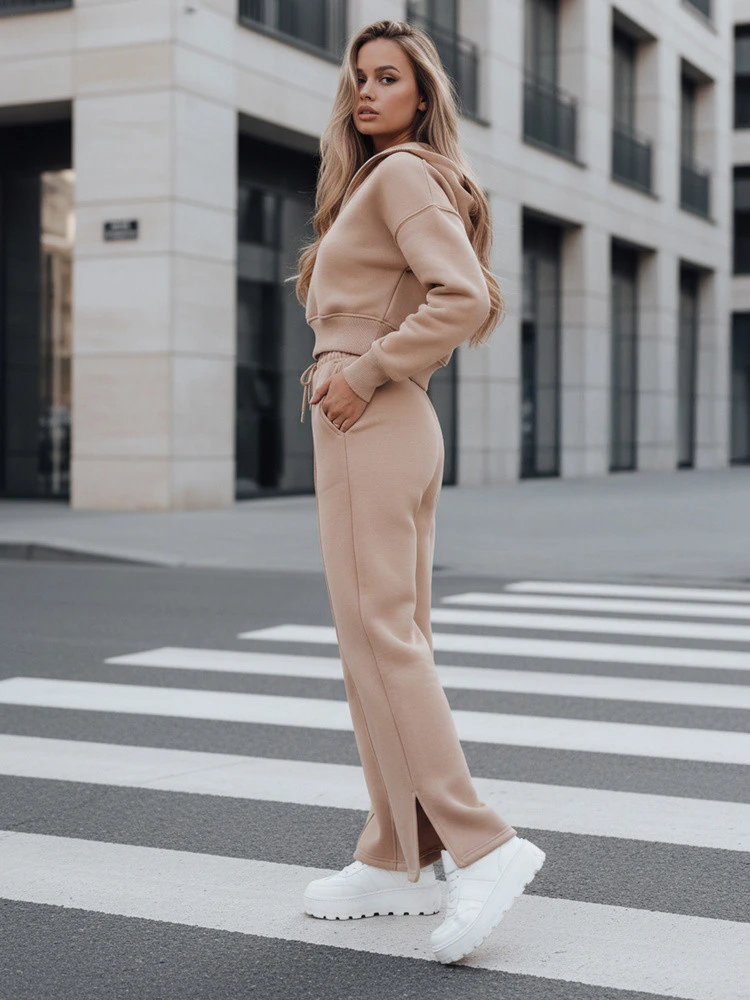 Tato dámská tepláková souprava s moderním městským charakterem kombinuje pohodlí při nošení s rafinovaným střihem. Soupravu tvoří mikina s kapucí a krátkým zipem a kalhoty s rovnými nohavicemi. Bavlněný materiál s příměsí elastanu a lycry zajišťuje pružnost a pohodlí při každodenním nošení. Celá souprava se bude skvěle hodit pro ležérní a městské stylizace.