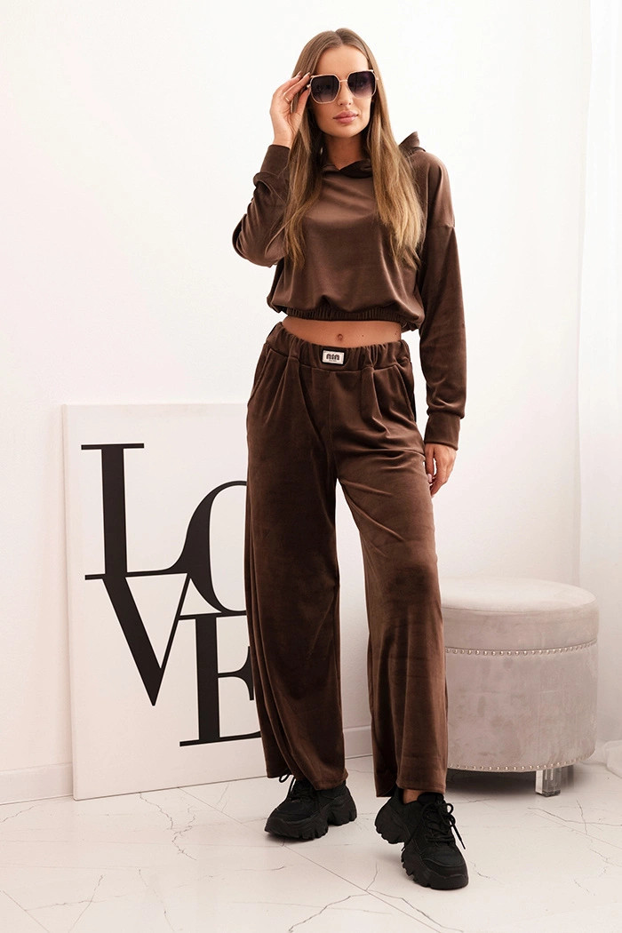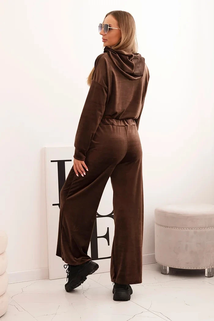 Dámský teplákový komplet z veluru se širokými nohavicemi a mikinou s kapucí hnědý