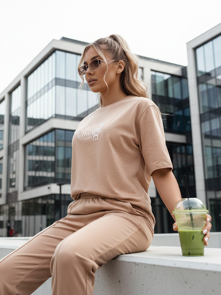 Souprava ZIMELAN v sobě spojuje ležérnost a sofistikovanost. Tričko s kulatým výstřihem a atraktivním potiskem je synonymem městského stylu, zatímco joggerové kalhoty se dvěma kapsami jsou vrcholem pohodlí. Vytvořeno pro nošení doma i při městských toulkách.