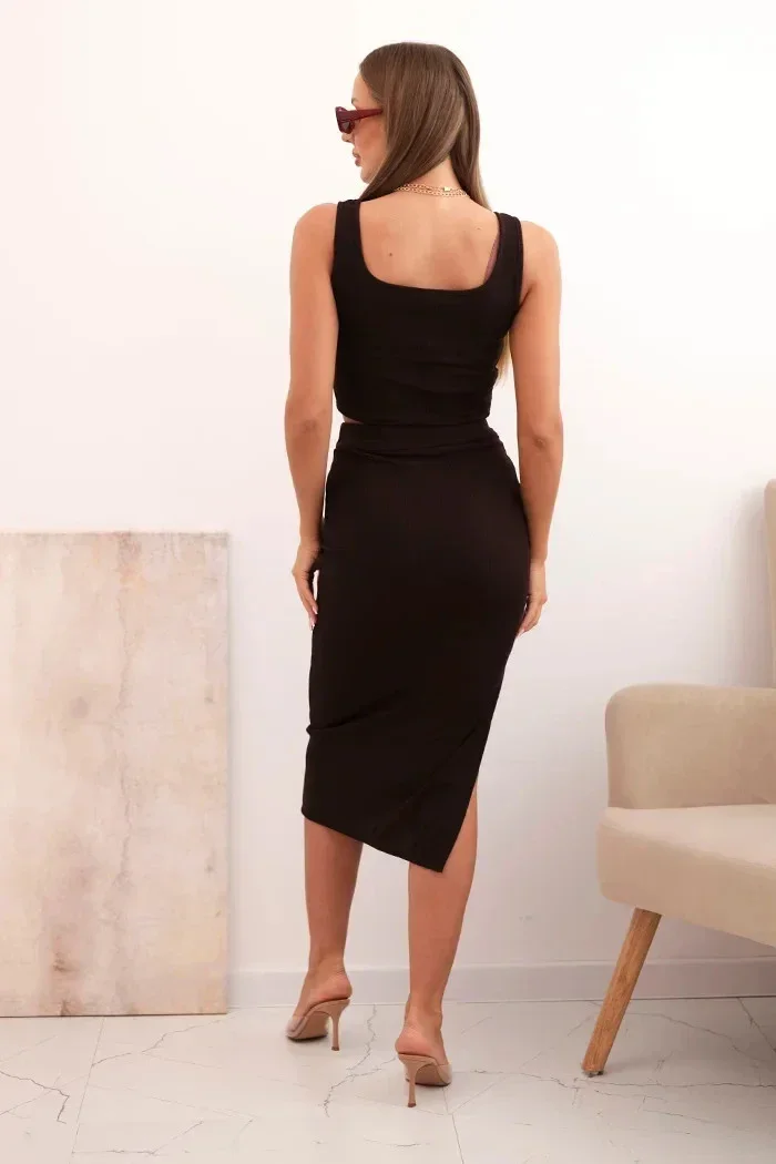 - Střih: přiléhavý komplet – krátký top + midi sukně