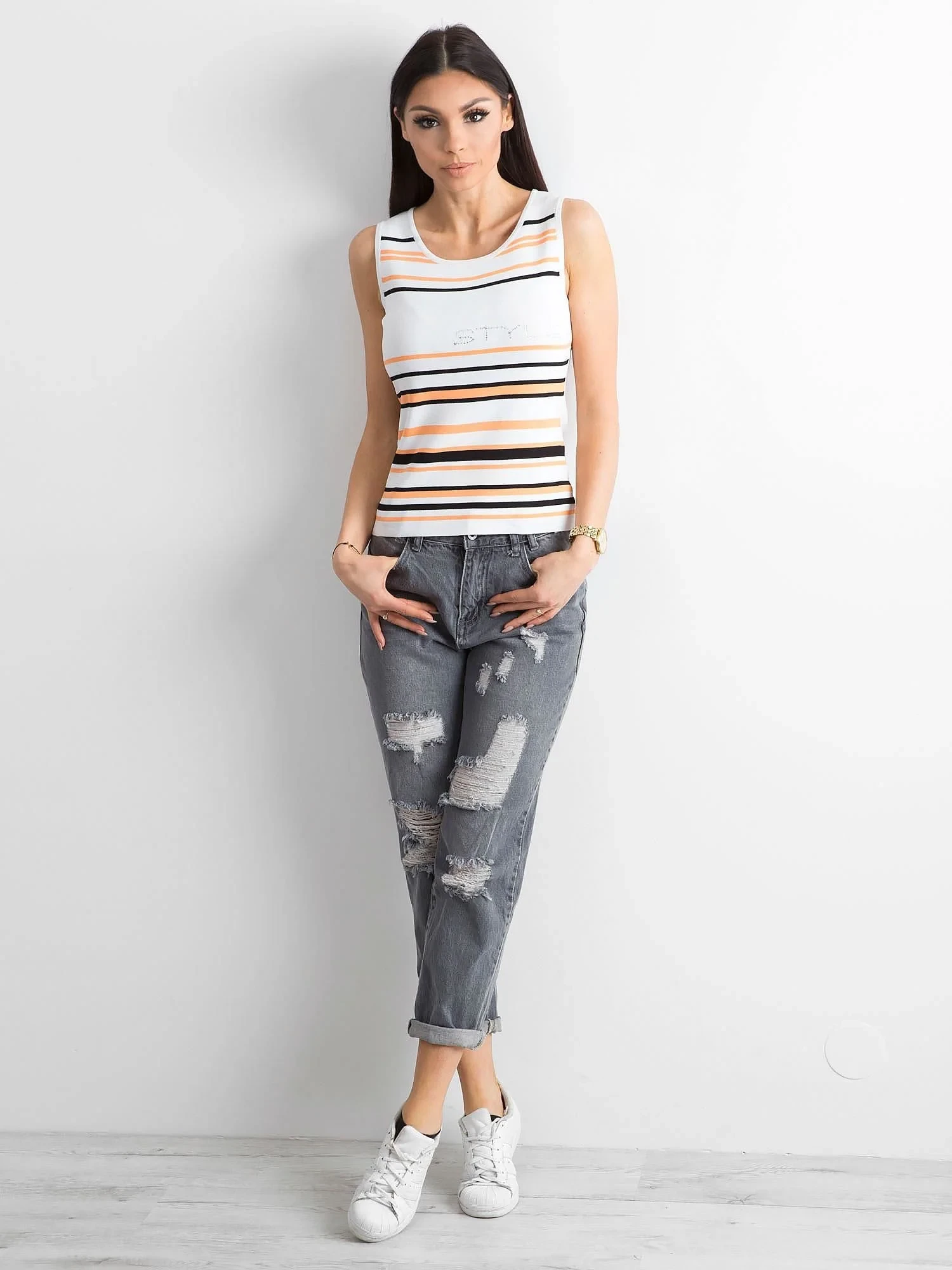 Bílý a oranžový pruhovaný top.