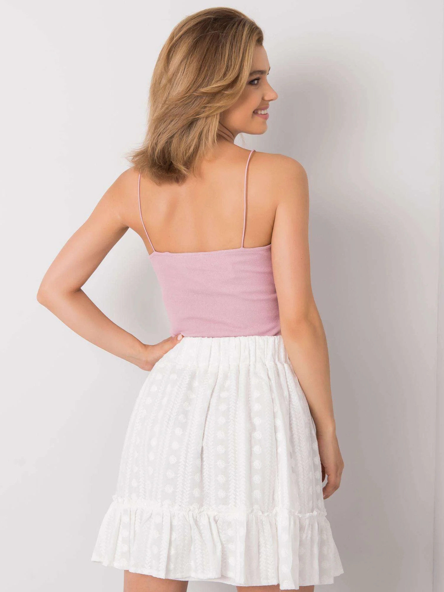 Špinavě růžový top bez ramínek.
